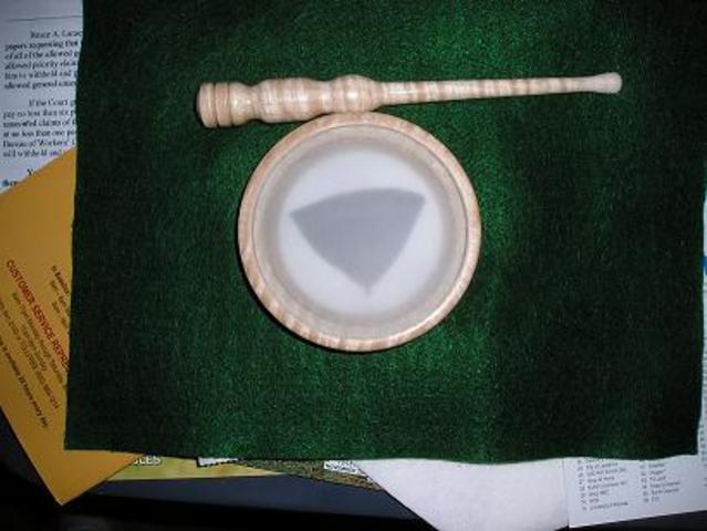 Tiger Maple 3.5" glass/glass with matching striker and a breastfeather from a tom a friend of mine shot the year before.